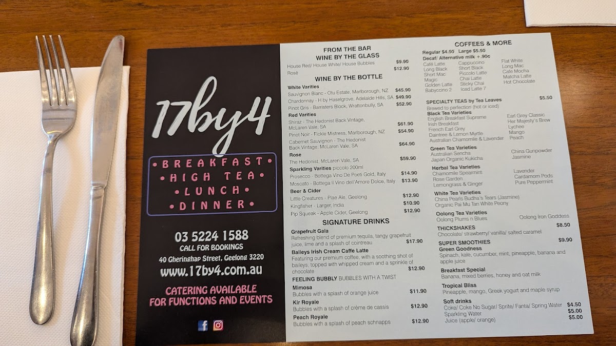 Welcome to 17by4, a delightful café nestled in the heart of Geelong at 40 Gheringhap St. This charming venue isn't just about good food; it captures a unique spirit, reflected in its name, symbolizing a love for the homeland. The menu is a vibrant medley of flavors, featuring standout dishes like the Wagyu Cheese Burger and the indulgent Pappardelle Ragu.